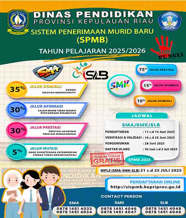 KEPRI (DISDIK) –Sistem Penerimaan Murid Baru (SPMB) untuk jenjang SMA, SMK, dan SLB tahun pelajaran 2025/2026 akan segera dibuka. Pendaftaran akan berlangsung mulai tanggal 11 hingga 14 Juni 2025, melalui laman resmi [http://sismpmb.kepriprov.go.id](http://sismpmb.kepriprov.go.id).