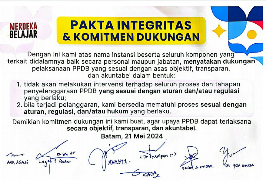 Dilaksanakan Juga Penandatanganan Pakta Integritas pelaksanaan PPDB yang sesuai aturan dan regulasi yang berlaku oleh Instansi dan Stakeholder Pendidikan yaitu: