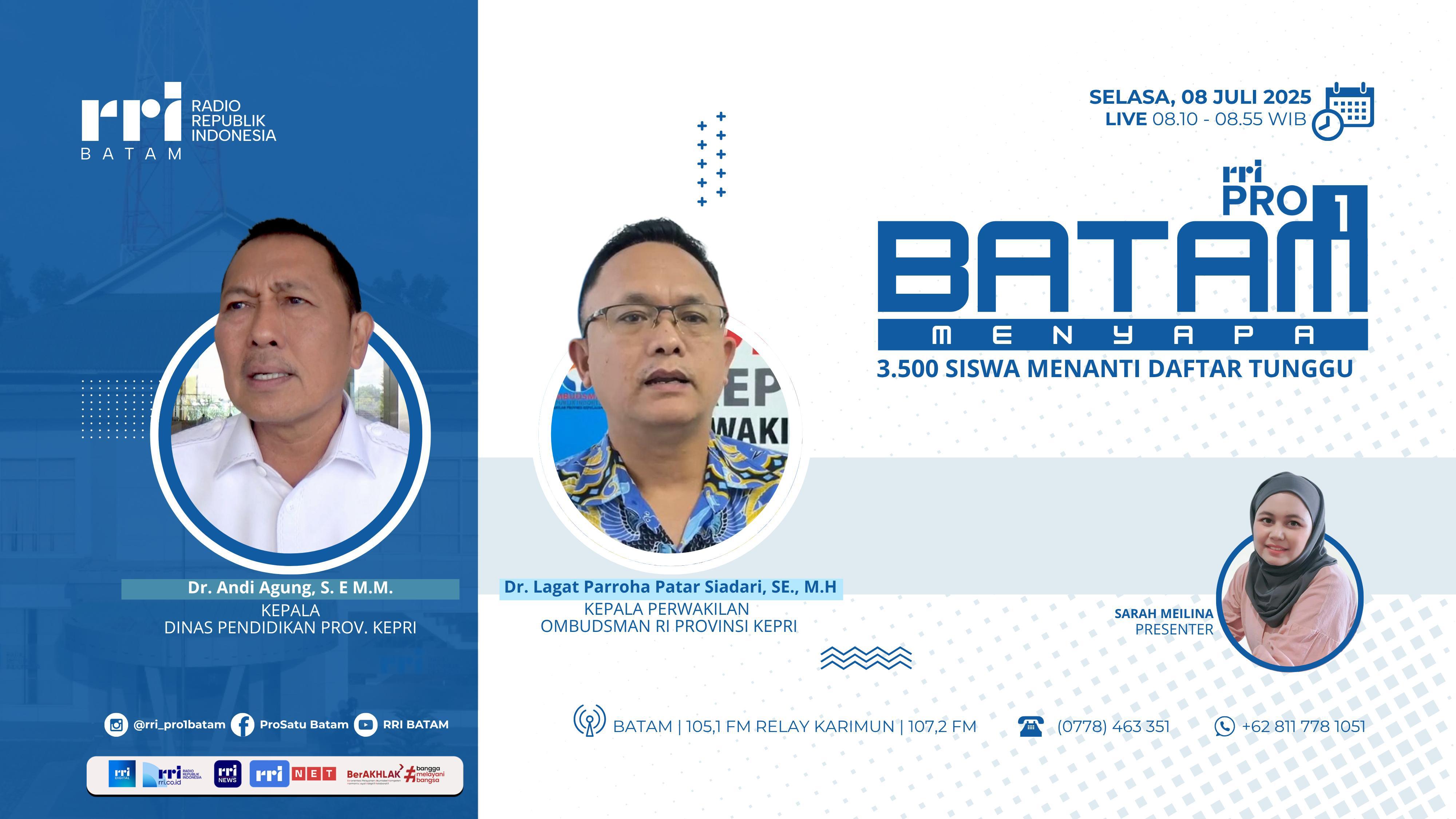 KEPRI (DISDIK) — Dinas Pendidikan Provinsi Kepulauan Riau (Kepri) menghadiri dialog interaktif di program Batam Menyapa RRI Pro 1 pada Selasa, 8 Juli 2025. Acara ini mengangkat tema “3.500 Siswa Menanti Daftar Tunggu” dan dipandu oleh Sarah Melina sebagai presenter.