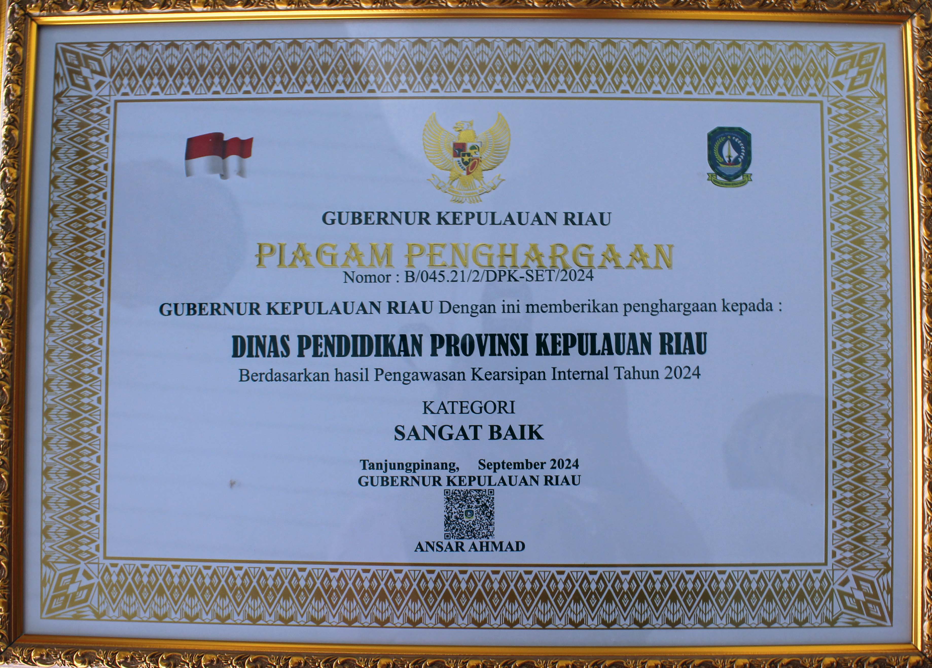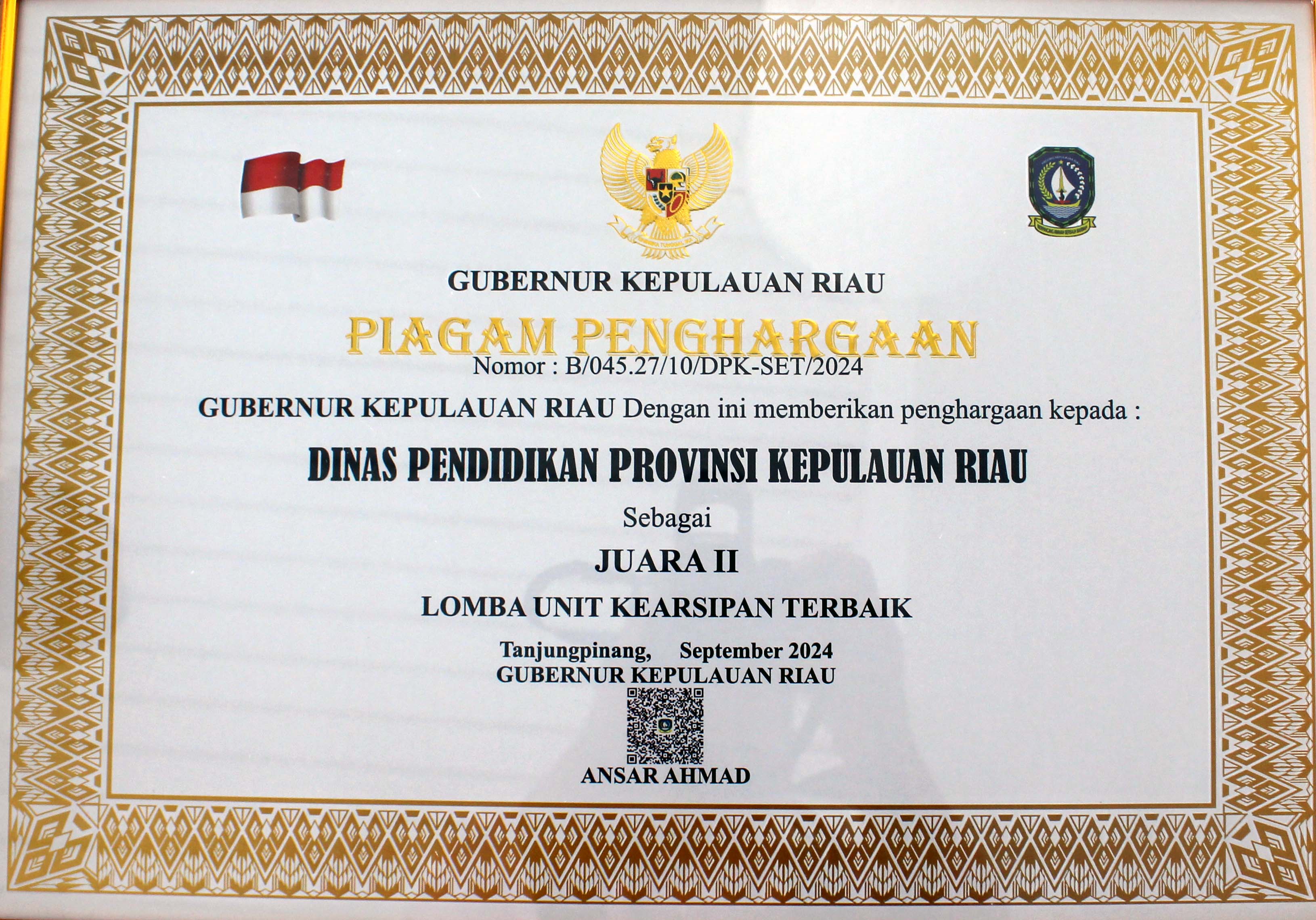 KEPRI (DISDIK) - Dinas Pendidikan Provinsi Kepulauan Riau (Kepri) berhasil meraih Juara II dalam Lomba Unit Kearsipan Terbaik dan mendapatkan predikat "Sangat Baik" untuk hasil pengawasan kearsipan internal di lingkungan Pemerintah Provinsi Kepri Tahun 2024.