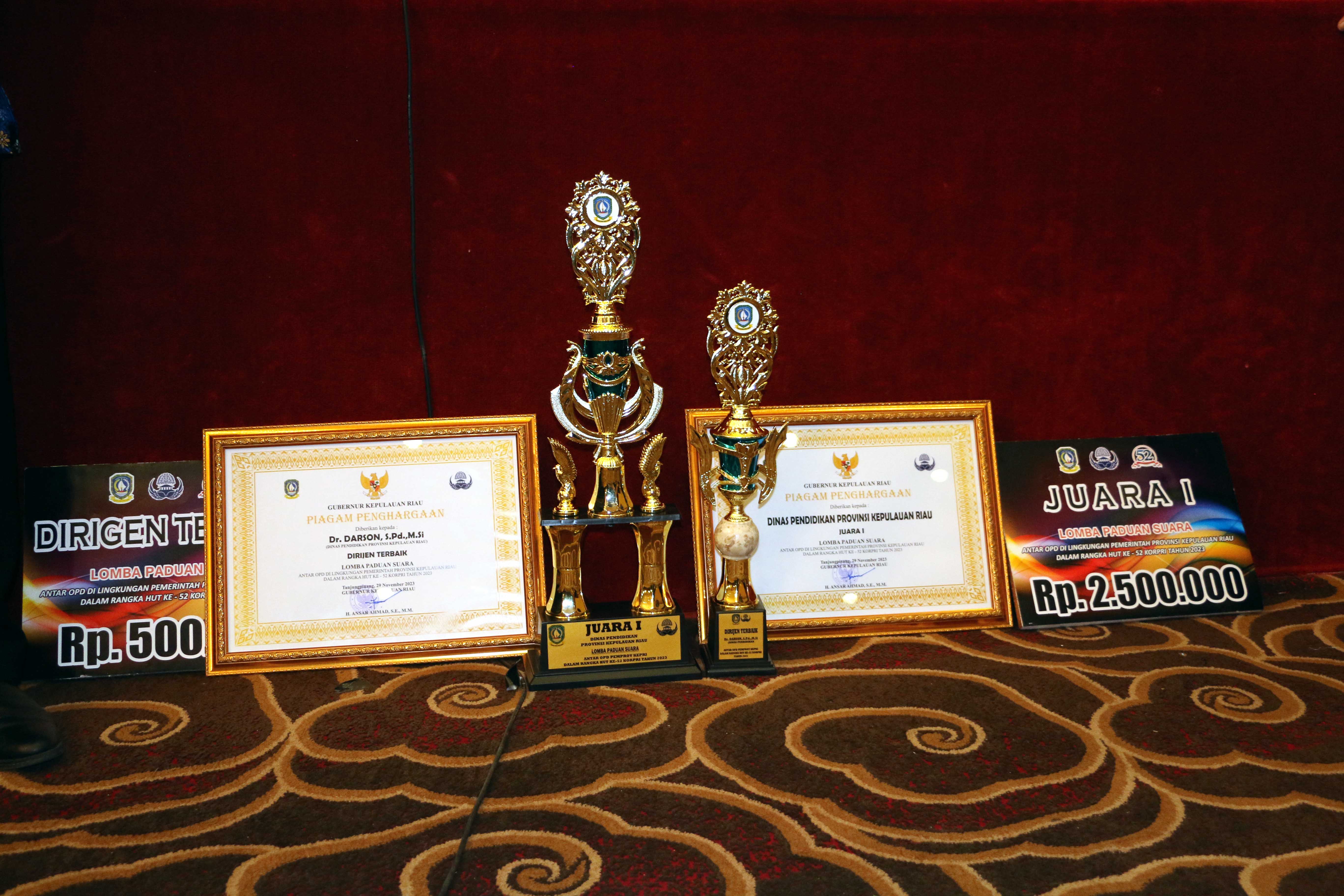 KEPRI-(Disdik) Dinas Pendidikan Provinsi Kepri boyong dua juara, juara 1 Lomba paduan suara antar OPD, dan dirigen terbaik yang diberikan kepada Sekretaris Dinas Pendidikan Dr. Darson, S. Pd., M.Si.