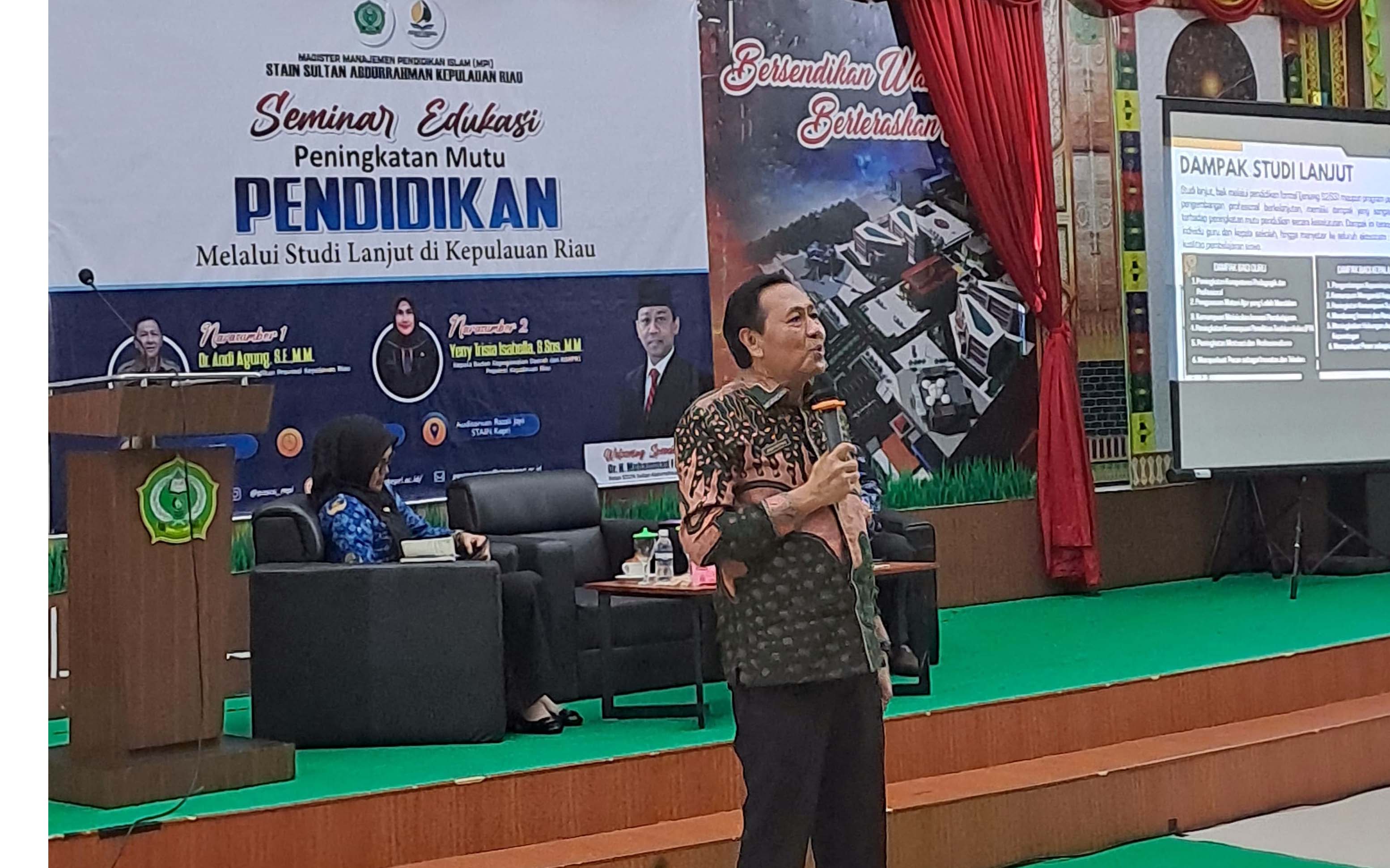 KEPRI (DISDIK) – Kepala Dinas Pendidikan Provinsi Kepulauan Riau, Dr. Andi Agung, S.E., M.M., menjadi narasumber utama dalam Seminar Peningkatan Mutu Pendidikan Melalui Studi Lanjut di Kepulauan Riau yang diselenggarakan oleh Program Studi Magister Manajemen Pendidikan Islam STAIN Sultan Abdurrahman.