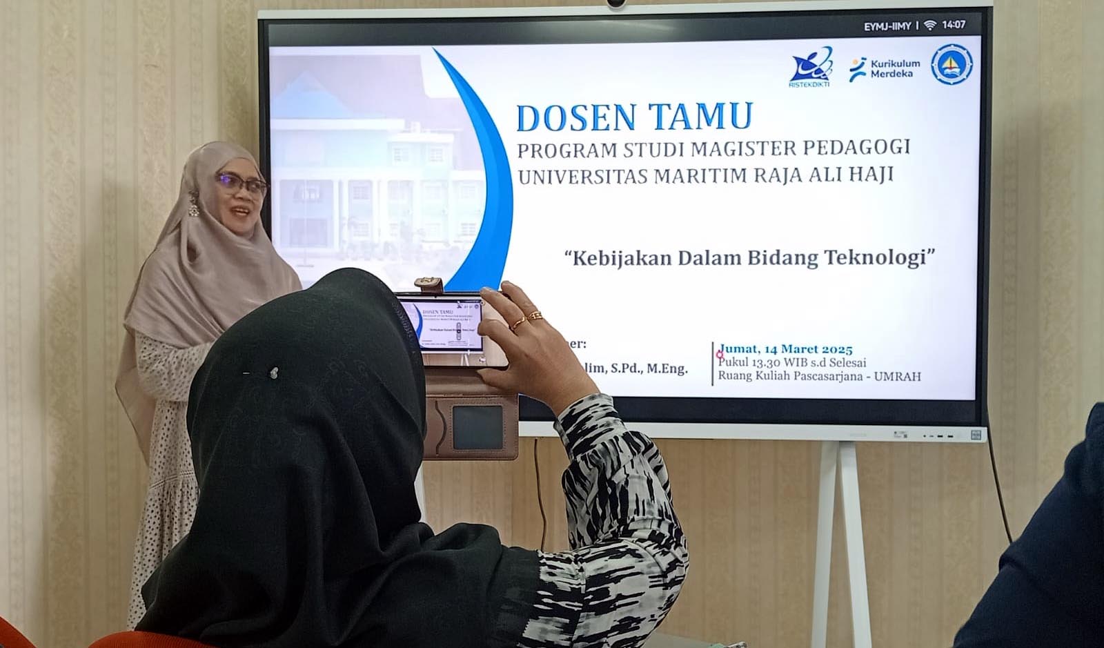 Kuliah tamu ini berlangsung pukul 13.30 WIB di Ruang Jenangkas 2.1, Program Pascasarjana UMRAH. Dalam kesempatan tersebut, Dr. Kalbin Salim membahas berbagai aspek kebijakan pendidikan, terutama terkait penggunaan teknologi dalam pembelajaran di daerah terpencil dan kepulauan.
