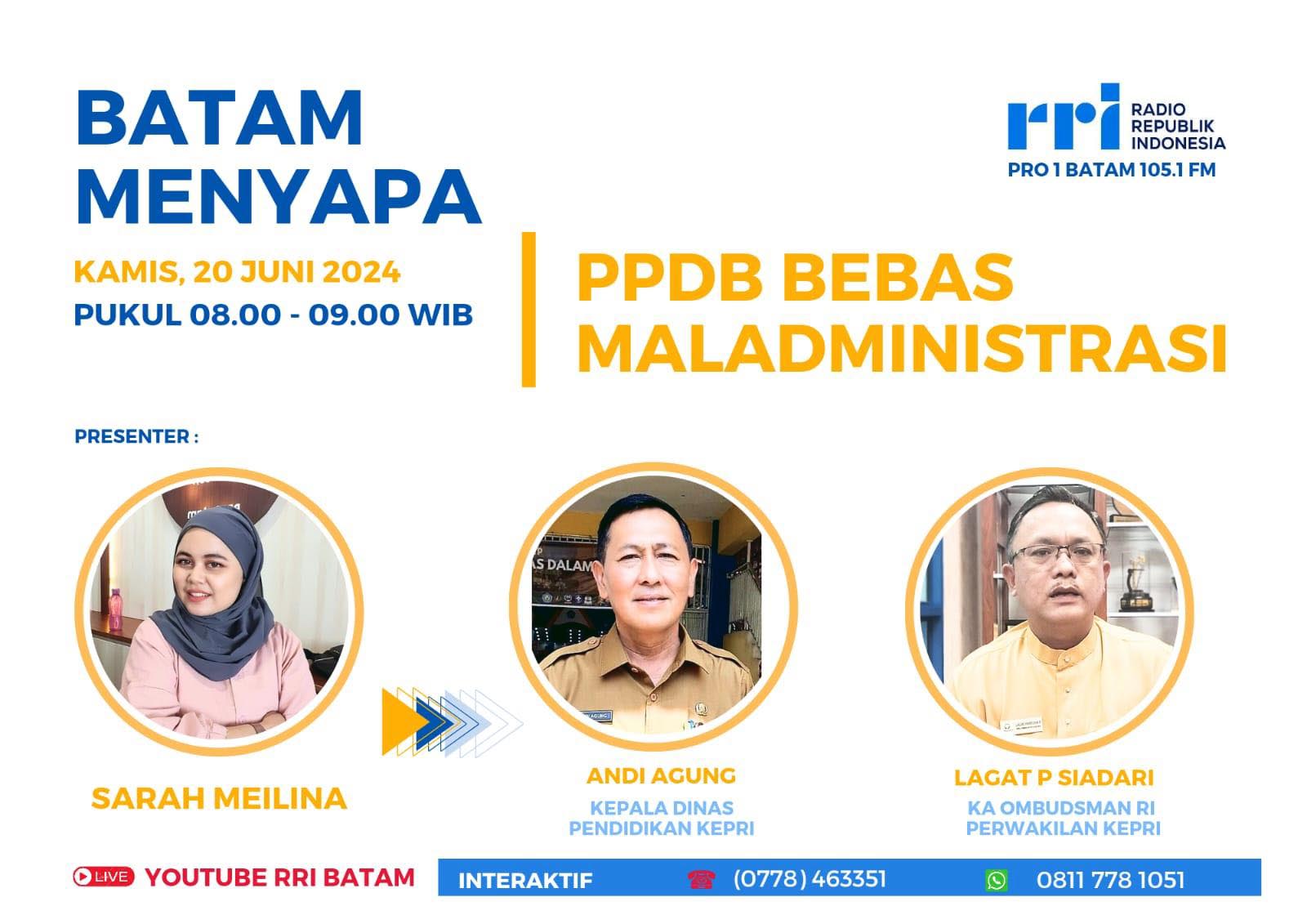KEPRI (DISDIK) - Kepala Dinas Pendidikan Provinsi Kepulauan Riau, Dr. Andi Agung, S.E., M.M., menghadiri dialog "Batam Menyapa" di RRI Pro 1 Batam pada Kamis, 20 Juni 2024. Dialog yang dipandu oleh Sarah Melina ini mengambil tema "PPDB Bebas Maladministrasi"