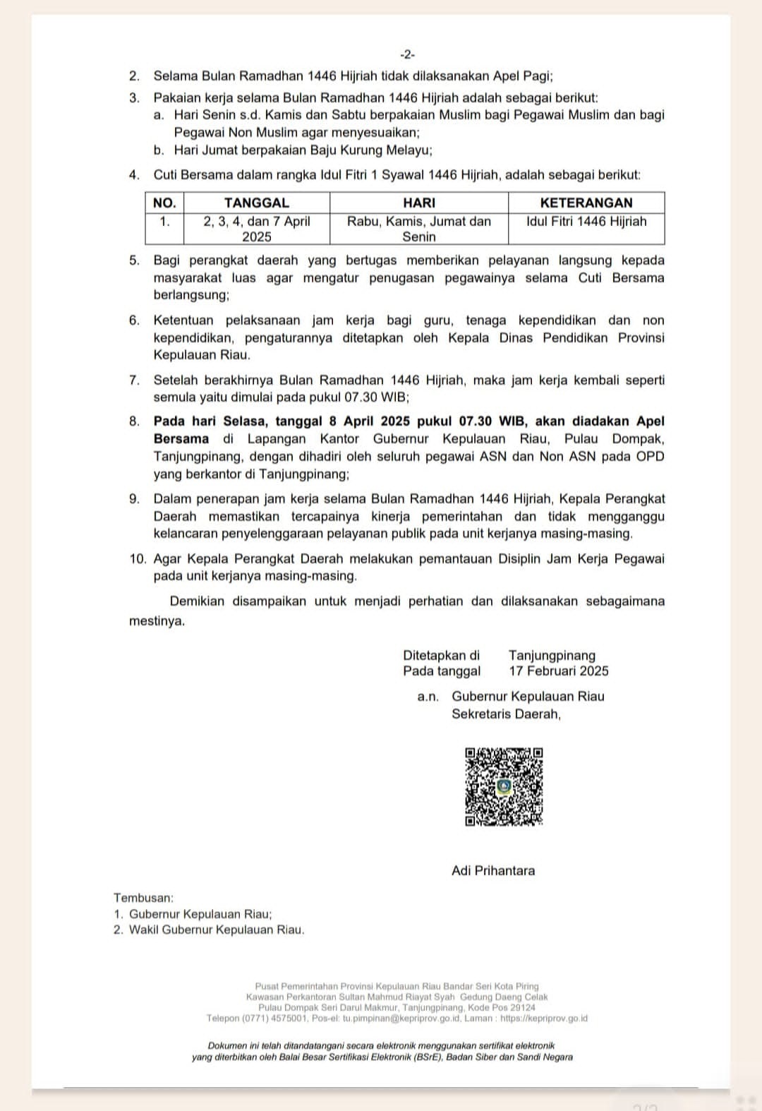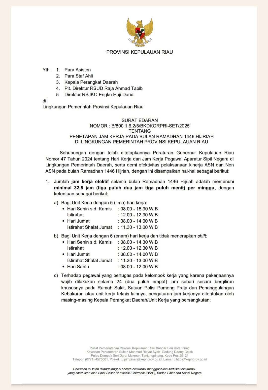 KEPRI (DISDIK) – Pemerintah Provinsi Kepulauan Riau resmi mengeluarkan Surat Edaran Nomor: B/800.1.6.2/5/BKDKORPRI-SET/2025 tentang Penetapan Jam Kerja pada Bulan Ramadhan 1446 Hijriah. Surat edaran ini mengatur jam kerja bagi Aparatur Sipil Negara (ASN) dan Non-ASN di lingkungan Pemprov Kepulauan Riau guna meningkatkan efektivitas kerja selama bulan suci, 18/2/2025.